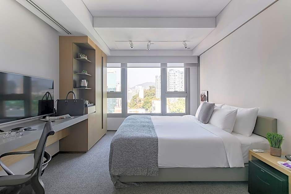 Featuring with concealed vanity and dual-head massage shower, the room allows a creative balance of living and resting space, with remarkable views of city landmarks. Remote controlled lightings, oversize flat-screen TV with state-of-the-art screen sharing and music connectivity.